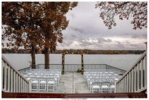 The ceremony took place outdoors just outside the clubhouse, overlooking the water. With around 50 to 100 guests, it felt intimate without being small, and everyone had a clear view of the couple as they said their vows. The natural backdrop of Lake Wylie did most of the work, creating a calm and open setting that didn’t need much added decor. As guests sat facing the water, the ceremony felt personal and relaxed, which is exactly what many couples are looking for when planning a Red Fez Shrine Club wedding.