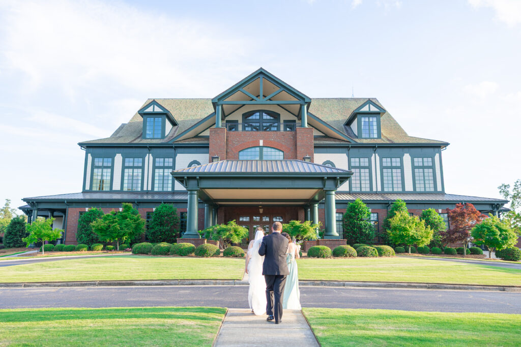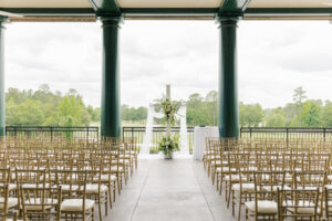 Guests arrived in the late afternoon to soft string covers playing as they took their seats on the covered veranda just outside the reception space. The ceremony overlooking the property brought in natural light while still offering protection from the elements, which is one of the biggest advantages of choosing River Landing in Wallace, North Carolina. With around 50 to 100 guests, the setting felt intimate while still giving everyone room to take in the view and be part of the moment.