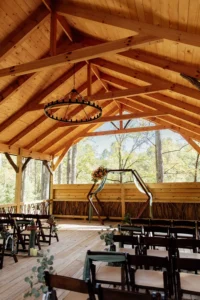 One of the more unique aspects of this Running Cedar Springs wedding was how the reception space transformed throughout the night. The same pavilion used for the ceremony earlier in the day became the dance floor, creating a natural progression without requiring guests to relocate far . That kind of setup keeps guests engaged because there is no downtime or confusion about where to go next.