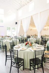 One of the most distinctive features of the venue is its signature white barn. The structure is designed with a clean, modern aesthetic that elevates the traditional barn concept. The exterior features a whitewashed façade, while the interior includes large 18-foot windows, high ceilings, and an abundance of natural light.  Inside the main ballroom, elements such as chandeliers, French doors, and expansive windows create a bright and elegant atmosphere that feels both upscale and inviting.  This design allows couples to achieve a refined look without requiring extensive décor.
