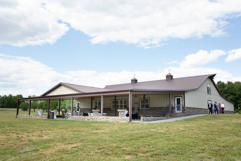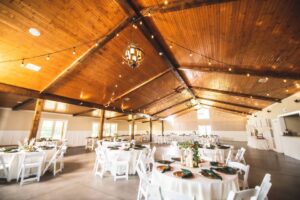 The venue centers around a large modern barn that serves as the primary reception space. This structure is fully enclosed and climate-controlled, offering comfort for guests year-round.  Inside, the barn features a spacious open layout that can accommodate over 200 seated guests, along with a built-in bar, catering kitchen, and indoor restrooms.  The design blends rustic charm with modern functionality, making it suitable for both elegant and more casual wedding styles.