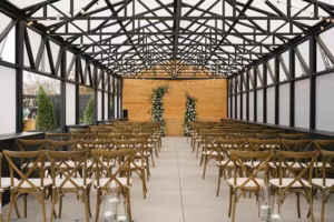 As a wedding venue, The Graham Mill is known for its combination of indoor and outdoor event spaces. Couples have access to three primary areas including the main hall, a backyard, and a greenhouse. The main hall is the centerpiece of the venue and features exposed brick walls, tall ceilings, large windows, and wooden beams. These elements create a bright, open space filled with natural light, making it ideal for ceremonies, receptions, and large gatherings.