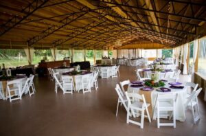 Wedding receptions at The Oaks typically take place in the venue’s spacious pavilion. The pavilion offers approximately 4,000 square feet of event space and is fully enclosed with heating and air conditioning so that events can be held comfortably throughout the year. The structure features polished concrete flooring, decorative lighting, and open views of the lake and surrounding property. This flexible reception space allows couples to host dinner, dancing, and entertainment all in one place while still enjoying the beauty of the outdoor setting.