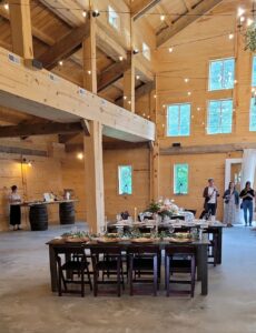 As a wedding venue, Twin Oaks Barn is designed to host a full wedding day in one cohesive space. The property features a large, climate-controlled barn with over 6,000 square feet of event space, allowing couples to comfortably host ceremonies, receptions, and celebrations year-round.  The barn includes a spacious main hall with vaulted ceilings, exposed wooden trusses, and statement chandeliers, creating a balance between rustic charm and a polished, modern aesthetic. This design allows couples to achieve a refined look without requiring heavy décor, while still maintaining the warmth of a traditional barn setting.
