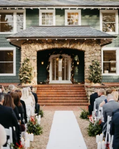 One of the most distinctive features of the estate is its architectural design. The main house showcases classic Craftsman-style elements, including wood detailing, stone features, and original fireplaces. Inside, the space maintains a refined and timeless aesthetic, making it well-suited for both traditional and modern weddings. The interior rooms can be used for smaller gatherings, cocktail hours, or as part of a larger event layout, depending on the couple’s vision.