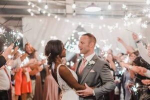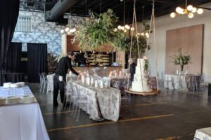 One of the most defining features of Whitaker & Atlantic is its industrial design. The venue features a large open “grand room” with high ceilings, exposed steel, textured concrete floors, and gold-accented lighting. This creates a modern yet warm atmosphere that works well for a wide range of wedding styles, from minimalist to more elaborate designs. The neutral color palette of soft grays, blush, and ivory allows couples to fully customize the space without needing heavy décor.